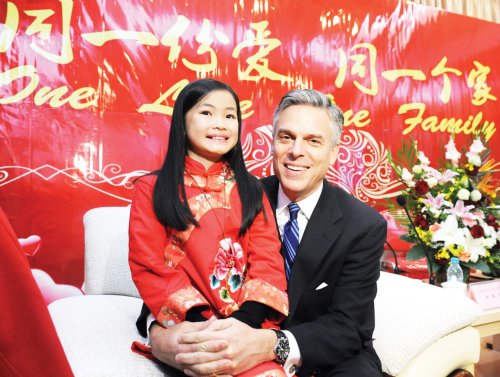 图中,依偎在前美驻华大使洪博培怀里的女孩,是他的中国养女杨乐意。