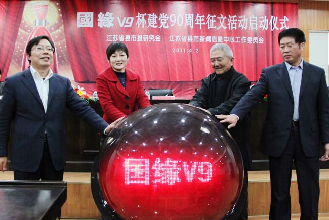4月2日,由江苏省县市报研究会、江苏省新闻信息中心工委以及江苏今世缘酒业股份有限公司联合举办的“国缘V9”杯庆祝建党90周年征文活动启动仪式在今世缘酒业举行。中共涟水县委常委、宣传部长王立华,省县市报研究会副会长、省新闻信息中心工委主任严峰,省县市报研究会名誉会长沈成嵩,省县市报研究会副秘书长、省新闻信息中心工委副主任吉光,省新闻中心工委副主任葛志亮,涟水县委宣传部副部长、新闻信息中心主任张学荣等全省市县报负责人出席此次活动。今世缘酒业董事长、总经理周素明,党委副书记、副总经理朱怀宝分别参加了欢迎宴会以及启动仪式。