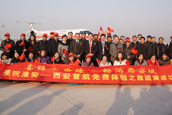3月27日上午7时50分,一架由东航EMB145执飞的MU2939次航班搭载着淮安及周边地区的45名幸运乘客从淮安涟水机场腾空而起,拉开了“喜结今世缘,畅游西安城”——淮安至西安免费双飞三日游体验之旅。副市长史国君参加首航仪式。9时50分,首航班机平稳降落在西安咸阳机场,标志着淮安至西安首航圆满成功。