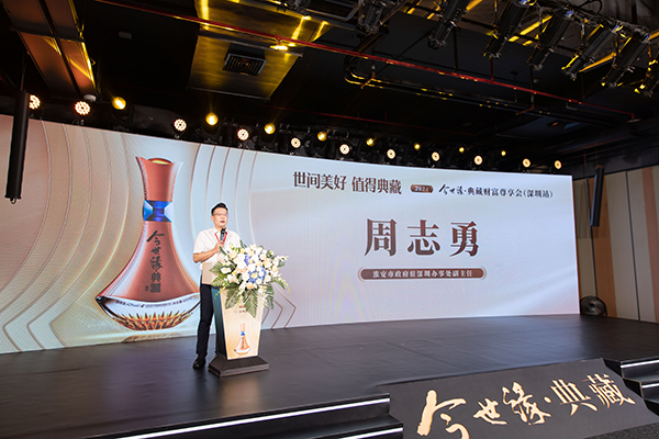 淮安市政府驻深圳办事处副主任周志勇发表致辞。他说,江苏淮安文化底蕴深厚,今世缘酒业作为淮安的杰出代表,此次在深圳举办今世缘·典藏财富尊享会暨新品上市发布会,不仅体现了对深圳市场的重视,也彰显了淮安与深圳之间日益密切的交流与合作。
