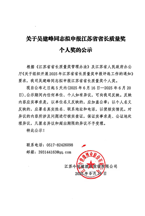 根据《江苏省省长质量奖管理办法》及江苏省人民政府办公厅《关于组织开展2025年江苏省省长质量奖申报评选工作的通知》要求,我司吴建峰同志拟申报江苏省省长质量奖个人奖。