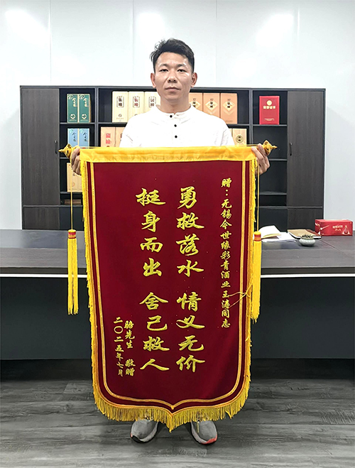 7月24日下午2点,无锡太湖千波桥水域附近突发紧急状况,一名群众不慎落水。危急时刻,今世缘酒业经销商主管、无锡彩青酒业副总经理王涛挺身而出,果断施救,成功将落水人员救起。他的见义勇为事迹在当地迅速传播,赢得广泛赞誉。