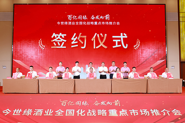 推介会现场举行了国缘品牌省外优秀客户代表合作签约仪式。来自山东、安徽、江西、湖北、湖南等地的经销商代表与今世缘签署了合作协议。