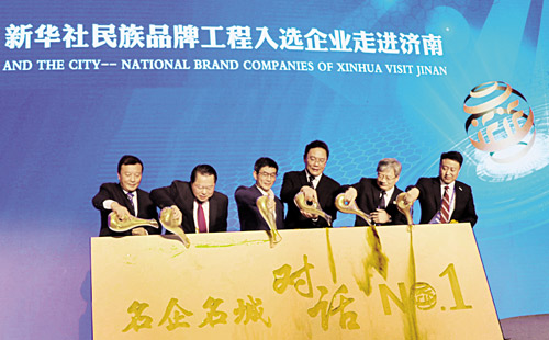 图为新华通讯社副社长兼秘书长刘正荣(左三),济南市委常委、副市长徐群(右三),全国政协委员、月星集团董事局主席丁佐宏(左二),全国人大代表,江苏今世缘酒业董事长、总经理周素明(左一),中国重汽集团副总裁宋其东(右二),浪潮集团副总裁卢文杰(右一)共同“浇金”,启动首期名企名城对话——新华社民族品牌工程入选企业走进济南仪式。