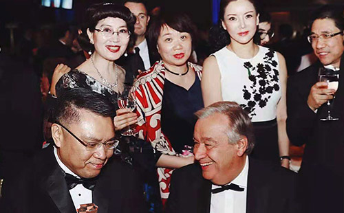 今世缘党委副书记、副总经理倪从春向联合国秘书长古特雷斯(右)介绍国缘酒