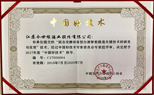 经中国好技术专家委员会专家组评审,“固态发酵浓香型白酒智能酿造关键技术的研发与应用”项目被授予“中国好技术”称号。该项目技术水平国际领先,具有独立的自主知识产权。在中国科学技术协会、科技部等主办的首届中国创新方法大赛总决赛上,今世缘代表队携《基于TRIZ方法白酒酿造过程中智能甑桶的研发》项目参赛,取得江苏代表团最好成绩,也是全国白酒业唯一参赛的企业。