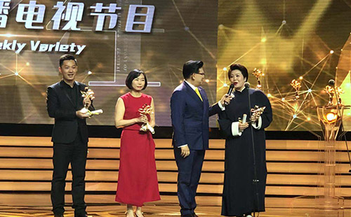 《今世缘·等着我》主持人舒冬(左)代表栏目组领取“白玉兰奖·最佳周播电视节目奖”