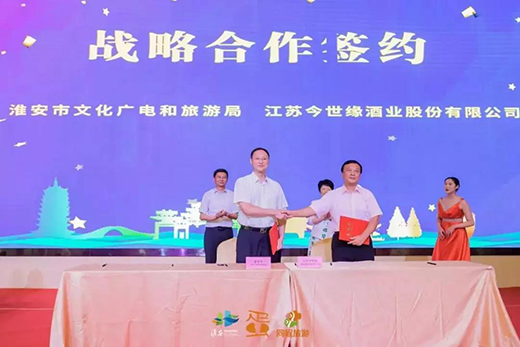 ▲淮安市文化广电和旅游局党委书记、局长张冲林与今世缘酒业股份有限公司董事长周素明签订关于打造淮安掼蛋文化旅游基地协议。启动仪式上,今世缘文旅公司还与10家旅行商现场签订了战略合作协议。