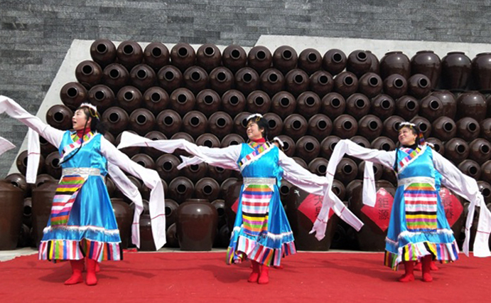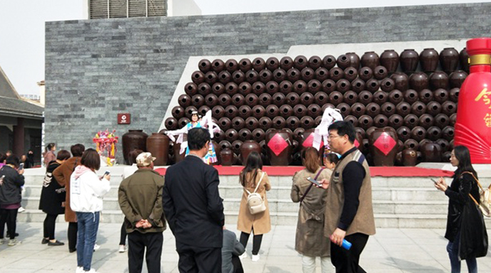 3月30日上午,高沟镇许庄村老年艺术团的演员在今世缘景区高沟酒非遗保护区的酒艺广场表演了具地方特色文化的歌舞节目,300多名游客观看了节目。