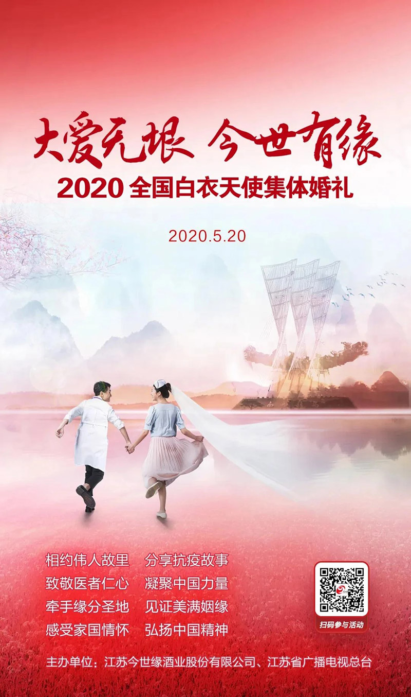 这是一份春天的请柬,这是一次五月的约定。2020年5月20日,“爱你爱你,我爱你!”。在这特别的日子,为表达对全国白衣天使的敬意和祝福,今世缘酒业携手江苏省广播电视总台综艺频道,举办全国白衣天使集体婚礼,礼赞英雄儿女,开启幸福旅程。