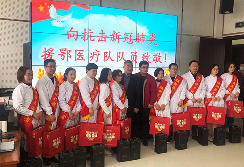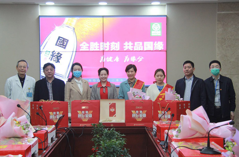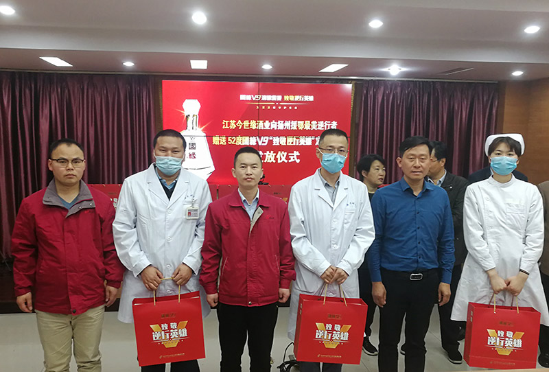 4月22日下午,苏中大区兴化办事处携手经销商代表,在兴化市人民医院为13名兴化援鄂英雄们送上特制美酒国缘V9。