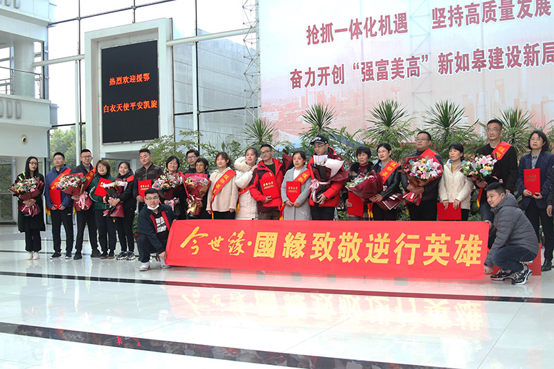 勇士逆行时,朔风凛冽寒未尽;英雄归来日,春华正浓花满枝。4月11日,在如皋市委、市政府举行的迎接11名援鄂医疗队员回如返岗欢迎仪式上,今世缘酒业苏中大区如皋办事处为英雄们送上了特制的国缘V9,表达对英雄的敬意和祝福。