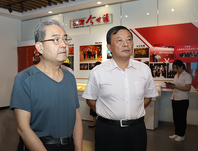 江苏省人民政府原省长季允石(左)在今世缘酒业党委书记、董事长、总经理周素明陪同下参观今世缘展示中心。