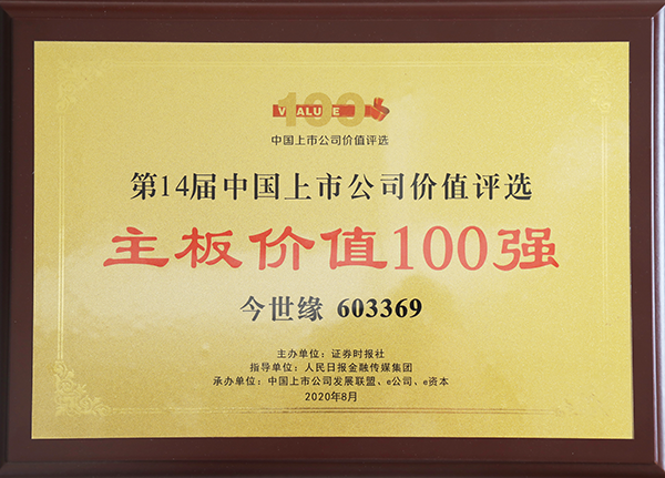 2020年8月28日,今世缘荣获中国上市公司“主板价值100强”。