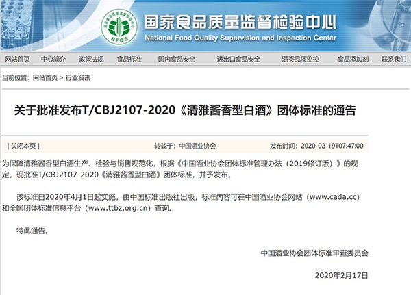 2020年2月17日,《清雅酱香型白酒》团体标准发布。