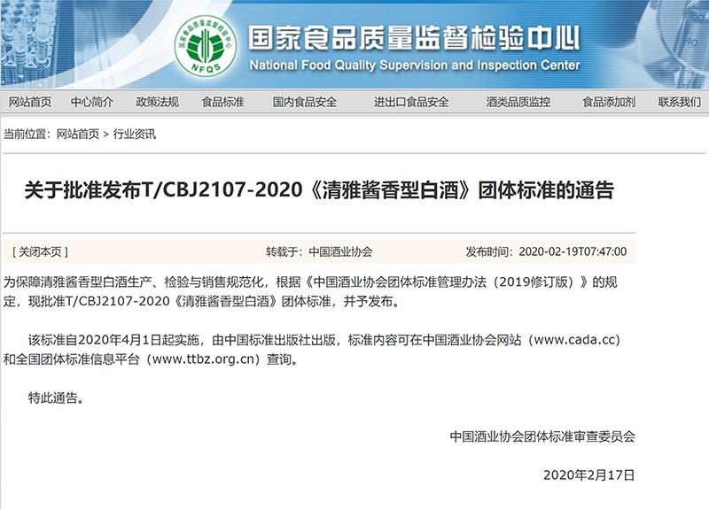 ● 2020年2月17日,《清雅酱香型白酒》团体标准发布。