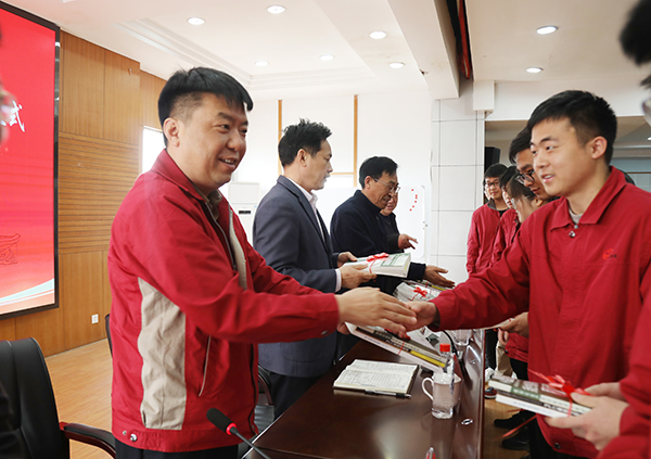 今世缘酒业党委副书记、工会主席鲁正波(左一)等领导为新学员授书。
