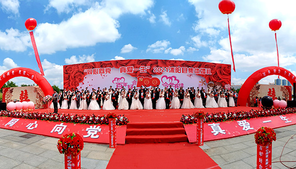 5月20日,“同心向党,真爱一生”2021沭阳县集体婚礼在南湖公园举行,100位新人喜结今世缘,以爱之名向党致敬。