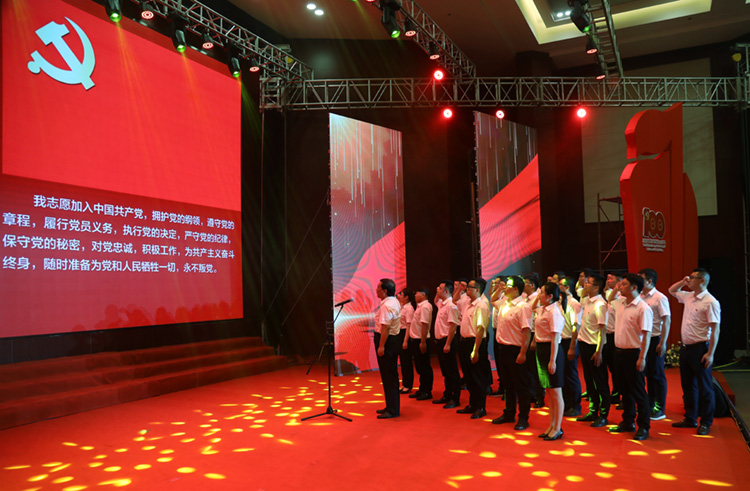 面对鲜红的党旗,周素明带领2021年新发展的20名预备党员进行入党宣誓:“我志愿加入中国共产党,拥护党的纲领,遵守党的章程,履行党员义务……”掷地有声、铿锵有力的誓言响彻讲堂,表达了新时代党员的责任和担当,更表达了对党忠诚、永不叛党的坚定承诺。