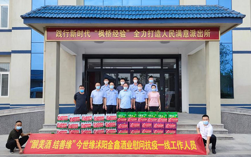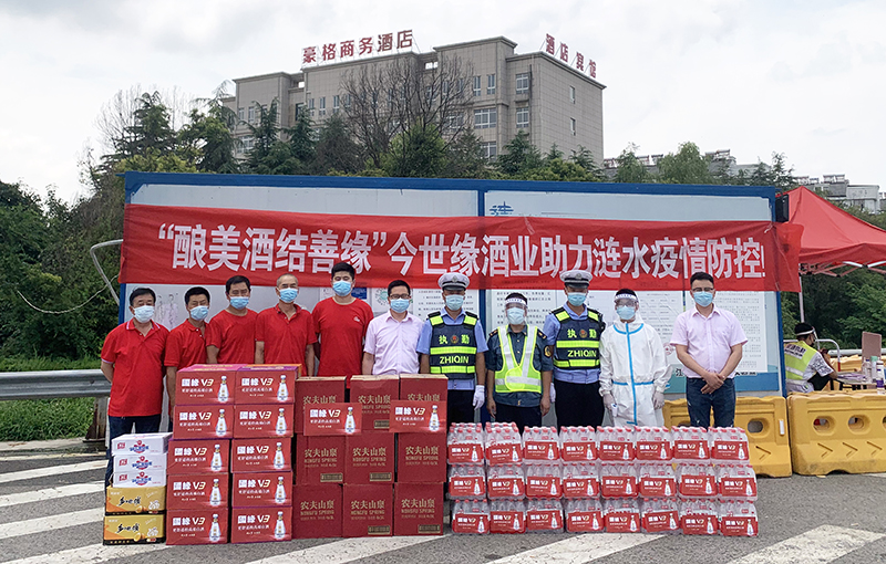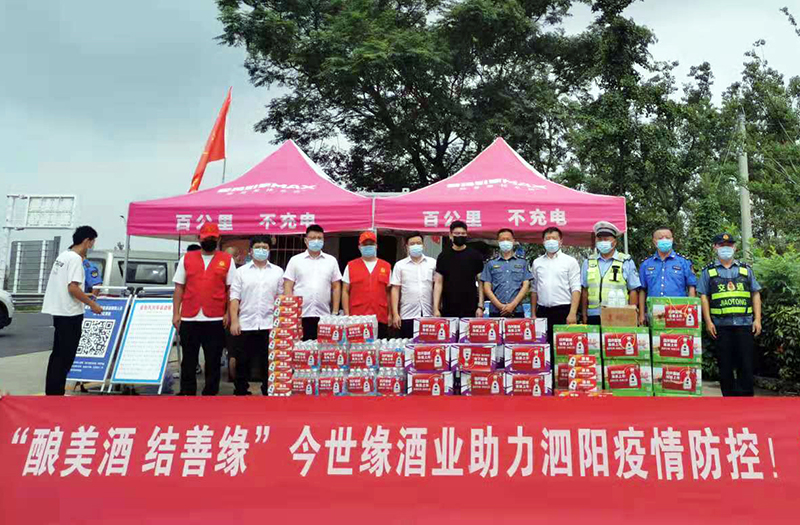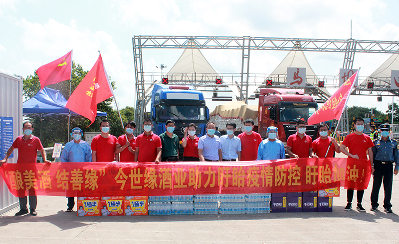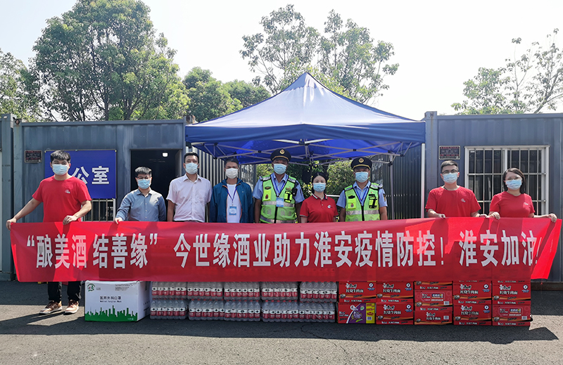 8月11日,今世缘酒业泗阳办事处携手经销商代表,慰问奋战在当地疫情防控一线的检查站人员,为他们送去消毒酒精、矿泉水、方便面和水果等物资。