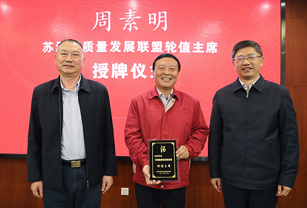 江苏省商务厅副厅长倪海清(右)与江苏省工信厅二级巡视员常如平(左)为今世缘酒业党委书记、董事长周素明颁发苏酒高质量发展联盟轮值主席牌匾。