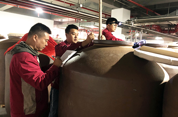 原酒打入陶坛后,一位师傅拿着长形的木条,另一位师傅拿着记录本,交流了一下,便拿来一大块红布把陶坛口盖上,系上绳子,压上盖子封坛。进酒时对酒的密度和酒度进行测定和记录,通过这种方法可以知道陶坛里酒的重量。徐娟娟说,陶坛稳定性高,在烧结过程中形成的微孔网状结构,可以促进白酒酯化反应和氧化还原反应,进而有效提升酒体质量。每年夏季,中心还会进行人工搅拌,促进原酒的老熟,及时了解原酒的挥发程度。