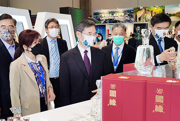 2021年12月9日,江苏省委常委、省委统战部部长惠建林(左四)在“澳门江苏周”期间视察今世缘展区。