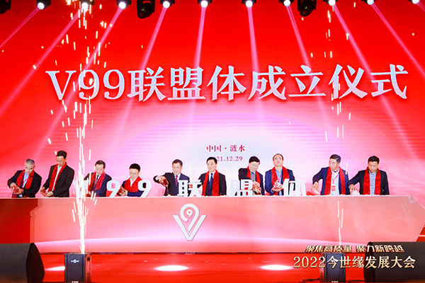 2021年12月29日上午,在2022今世缘发展大会上,江苏今世缘酒业股份有限公司发起组建的“V99联盟体”成立,38家经销客户成为首批成员单位。今世缘酒业党委副书记、副董事长、总经理顾祥悦与首批联盟体9名代表一起把醇香的国缘V9导入启动台中,共同开启“V99联盟体”新征程。