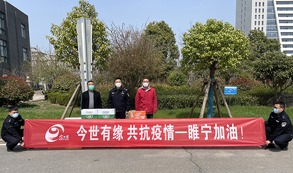 在徐州睢宁,今世缘睢宁办事处慰问睢宁县疫情防控人员,送去爱心物资,表达对一线防控人员的敬意。睢宁经济开发区派出所所长龚大勇说,今世缘送来的温暖,增添了大家同心战疫的信心。
