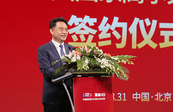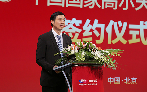 中国高尔夫球协会副主席兼秘书长庞政致辞(新华网 李然 摄)