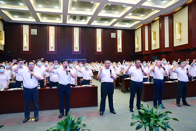 2022年6月7日,在今世缘“百日大会战”专题会上,营销系统与会人员集体宣誓。