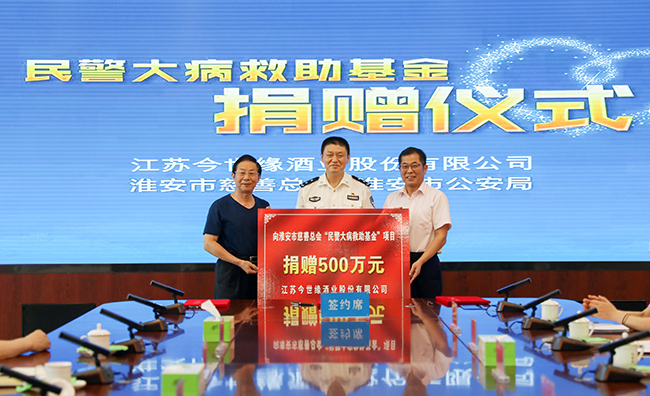 2022年6月30日,今世缘向淮安市慈善总会“民警大病救助基金”项目捐赠500万元爱心善款。