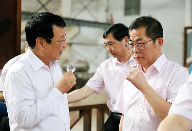 今世缘酒业党委书记、董事长、总经理顾祥悦与洋河股份党委副书记、总裁钟雨品尝洋河酿酒车间生产的原酒。