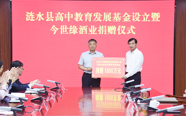 在涟水县高中教育发展基金设立暨今世缘酒业捐赠仪式上,今世缘酒业捐赠1000万元设立“今世缘奖教金”。