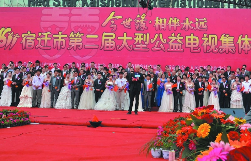 5月1日,30对新人参加了在泗阳举行的集体婚礼,婚礼现场花团锦簇,彩旗飘扬,洋溢着浓浓的喜庆氛围。5月2日,宿迁集体婚礼现场。来自各地的90对新人,伴着优美的《婚礼进行曲》,微笑着踏上红地毯,走进婚姻的殿堂。婚礼现场活动由江苏电视台《非诚勿扰》栏目组的乐嘉主持。据悉,婚礼活动的举办旨在倡导婚事新办简办和健康文明的社会新风尚,同时庆祝中国共产党建党90华诞。